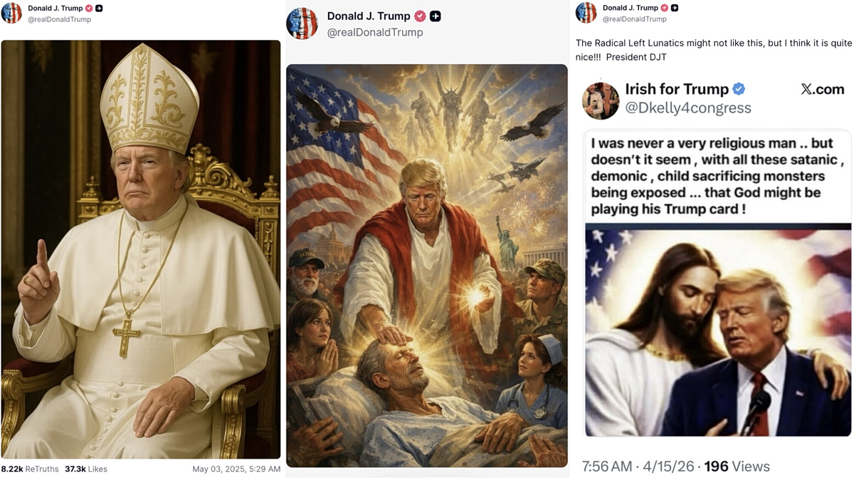 Λίγα 24ωρα μετά, εν μέσω της δημόσιας διαμάχης του με τον Πάπα Λέοντα ΙΔ΄για τον πόλεμο στο Ιράν και τη «θεϊκή» νομιμοποίηση που επικαλείται για τις πολιτικές του, εν γένει, ο Τραμπ ανάρτησε τη διαβόητη ΑΙ εικόνα του ως Ιησού.