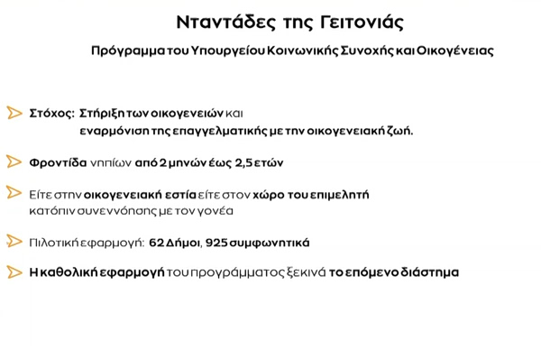 «Αυτήν τη Δευτέρα, 27 του μηνός, ξεκινάει το πρόγραμμα ‘Νταντάδες της γειτονιάς’. Όλοι όσοι επιθυμούν να εργαστούν ως επιμελητές θα μπουν στην πλατφόρμα για να συμπληρώσουν τα στοιχεία τους. (…) Αυτό το πρόγραμμα έχει ως στόχο να στηρίξει την οικογένεια, να εναρμονίσει την επαγγελματική με την οικογενειακή ζωή», αναφέρει στο MEGA η υφυπουργός Κοινωνικής Συνοχής και Οικογένειας, Έλενα Ράπτη.