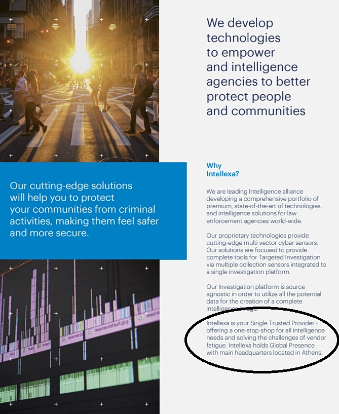 «Η Intellexa παρέχει στρατηγικούς αισθητήρες εθνικής εμβέλειας για τη συλλογή μαζικών δεδομένων και την ανάλυση όλων των επικοινωνιών των συνδρομητών. Οι λύσεις περιλαμβάνουν μια πλατφόρμα στοχευμένων νόμιμων υποκλοπών, συμβατών με όλους τους τύπους παρόχων δικτύου, μαζί με έναν ανιχνευτή IP υψηλής χωρητικότητας για τη μαζική ανάλυση της κίνησης του δικτύου», σημειώνεται χαρακτηριστικά.