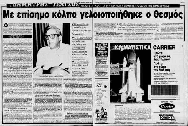*Αποσπάσματα από συνέντευξη που είχε παραχωρήσει ο Δημήτρης Τσάτσος (τότε πρόεδρος της Ένωσης Ελλήνων Συνταγματολόγων) στη δημοσιογράφο Τζώρτζια Κοντράρου το Μάρτιο του 1990, επί «οικουμενικής κυβερνήσεως» και έναν περίπου μήνα πριν από τις εθνικές εκλογές της 8ης Απριλίου 1990 (σε αυτές οδηγήθηκε η χώρα μετά τη διαπιστωθείσα «αδυναμία» της Βουλής να εκλέξει Πρόεδρο της Δημοκρατίας). Το κείμενο της συνέντευξης, που έφερε τον τίτλο «Με επίσημο κόλπο γελοιοποιήθηκε ο θεσμός», είχε δημοσιευτεί στο φύλλο των «Νέων» που είχε κυκλοφορήσει τη Δευτέρα 5 Μαρτίου 1990.