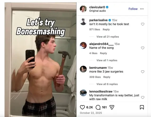 Σε μακροσκελείς αναρτήσεις γεμάτες επιστημονική ορολογία, ο Clavicular συζητούσε το ταξίδι του. Πέρασε ώρες προσαρμόζοντας την εικόνα του στο Photoshop για να δει πώς θα μπορούσε να μοιάζει μετά από χειρουργικές επεμβάσεις στην άνω γνάθο του, ή στα πόδια του.