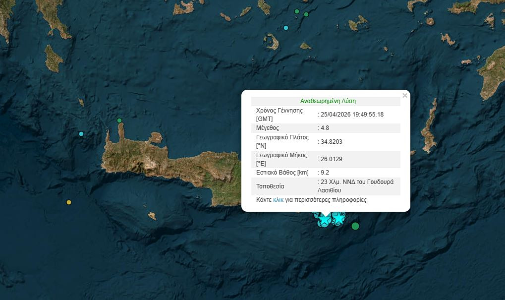 Σύμφωνα με την αναθεωρημένη μέτρηση του Γεωδυναμικού Ινστιτούτου ο σεισμός ήταν 4,8 Ρίχτερ και το επίκεντρο 23 χλμ νότια νοτιοδυτικά του Γούδουρα Λασιθίου. Το εστιακό βάθος μετρήθηκε στα 9,2 χιλιόμετρα.