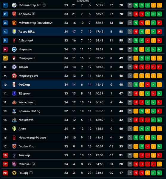 Η Βίλα που είχε ευκαιρίες για την ισοφάριση παραμένει σε τροχιά Champions League αλλά κινδυνεύει να μείνει πίσω από την 4η θέση. Η Φούλαμ διεκδικεί με αξιώσεις ευρωπαϊκό εισιτήριο.