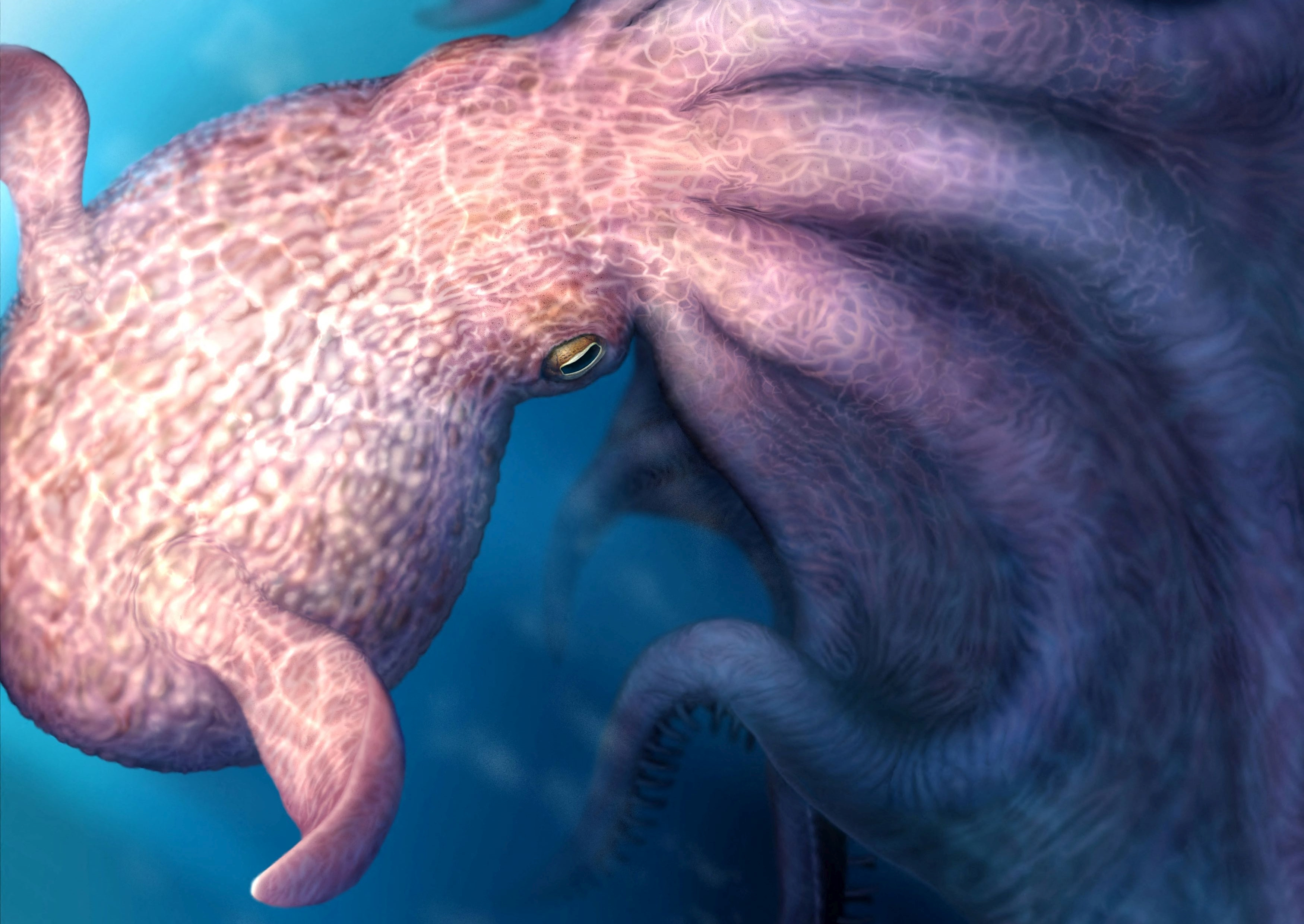 Απολιθωμένα ράμφη που ανακαλύφθηκαν ενσωματωμένα με πετρώματα 72-86 εκατομμυρίων ετών, στη διάρκεια της Κρητιδικής Περιόδου, πρέπει να ανήκουν σε ένα χταπόδι με μήκος έως 18,6 μέτρα, το οποίο οι ερευνητές ονόμασαν Nanaimoteuthis jeletzkyi (καλλιτεχνική απεικόνιση).