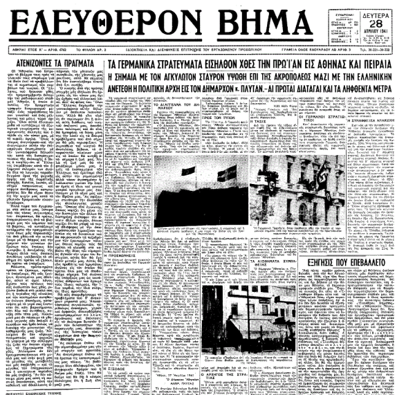 «ΕΛΕΥΘΕΡΟΝ ΒΗΜΑ», 28.4.1941, Ιστορικό Αρχείο «ΤΟ ΒΗΜΑ» & «ΤΑ ΝΕΑ»