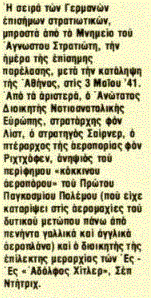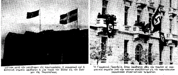 Το πρωί της Κυριακής 27ης Απριλίου 1941 τα γερμανικά στρατεύματα κατέλαβαν την Αθήνα και τον Πειραιά, η δε σημαία με τον αγκυλωτό σταυρό υψώθηκε στο Βράχο της Ακρόπολης. Η ελληνική πρωτεύουσα επέπρωτο να αποτινάξει το ζυγό της ναζιστικής δουλείας ύστερα από τριάμισι χρόνια, στις 12 Οκτωβρίου 1944.