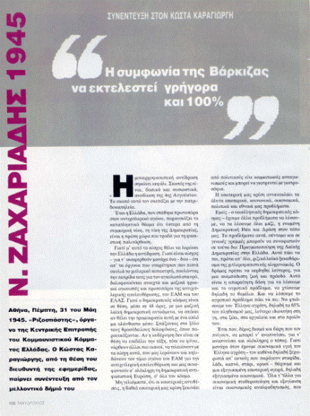Στο τεύχος του «Ταχυδρόμου» που είχε κυκλοφορήσει ανήμερα τα Χριστούγεννα του 1991, και στο πλαίσιο ενός πολυσέλιδου δημοσιεύματος υπό το γενικό τίτλο «Στον καθρέφτη είδα την ιστορία» (συνεντεύξεις με «10 ιερά τέρατα»), είχε συμπεριληφθεί το κείμενο μιας συνέντευξης που είχε παραχωρήσει ο Ζαχαριάδης στον Κώστα Καραγιώργη, διευθυντή του «Ριζοσπάστη», το 1945.