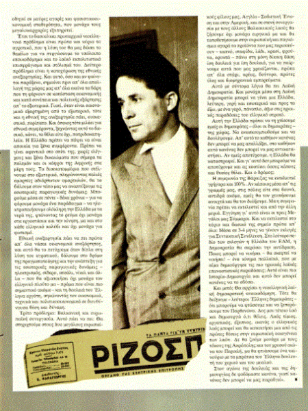 Εθνική ανεξαρτησία πάει να πει πρώτα απ’ όλα νάσαι οικονομικά ανεξάρτητος, και αυτό θα το πετύχουμε όταν δίπλα στη λύση του αγροτικού, βάλουμε στο δρόμο της πραγματοποίησης και την ανάπτυξη για τις εσωτερικές παραγωγικές δυνάμεις —ηλεκτρισμός, σίδερο, ατσάλι, νίκελ και άλλα— που θα αξιοποιήσει όχι μονάχα τον ελληνικό πλούτο μα —πράμα που είναι πιο σημαντικό ακόμα— και τη δουλειά του Έλληνα εργάτη, σηκώνοντάς τον οικονομικά, τεχνικά και πολιτικοοικονομικά σε διευθύνουσα θέση και δύναμη.