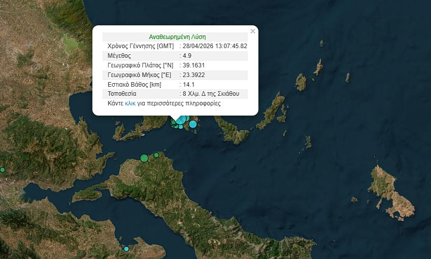 Σύμφωνα με το Γεωδυναμικό Ινστιτούτο ο σεισμός μεγέθους 4,9 Ρίχτερ σημειώθηκε λίγα λεπτά μετά τις 4 και είχε επίκεντρο 8 χιλιόμετρα δυτικά της Σκιάθου.