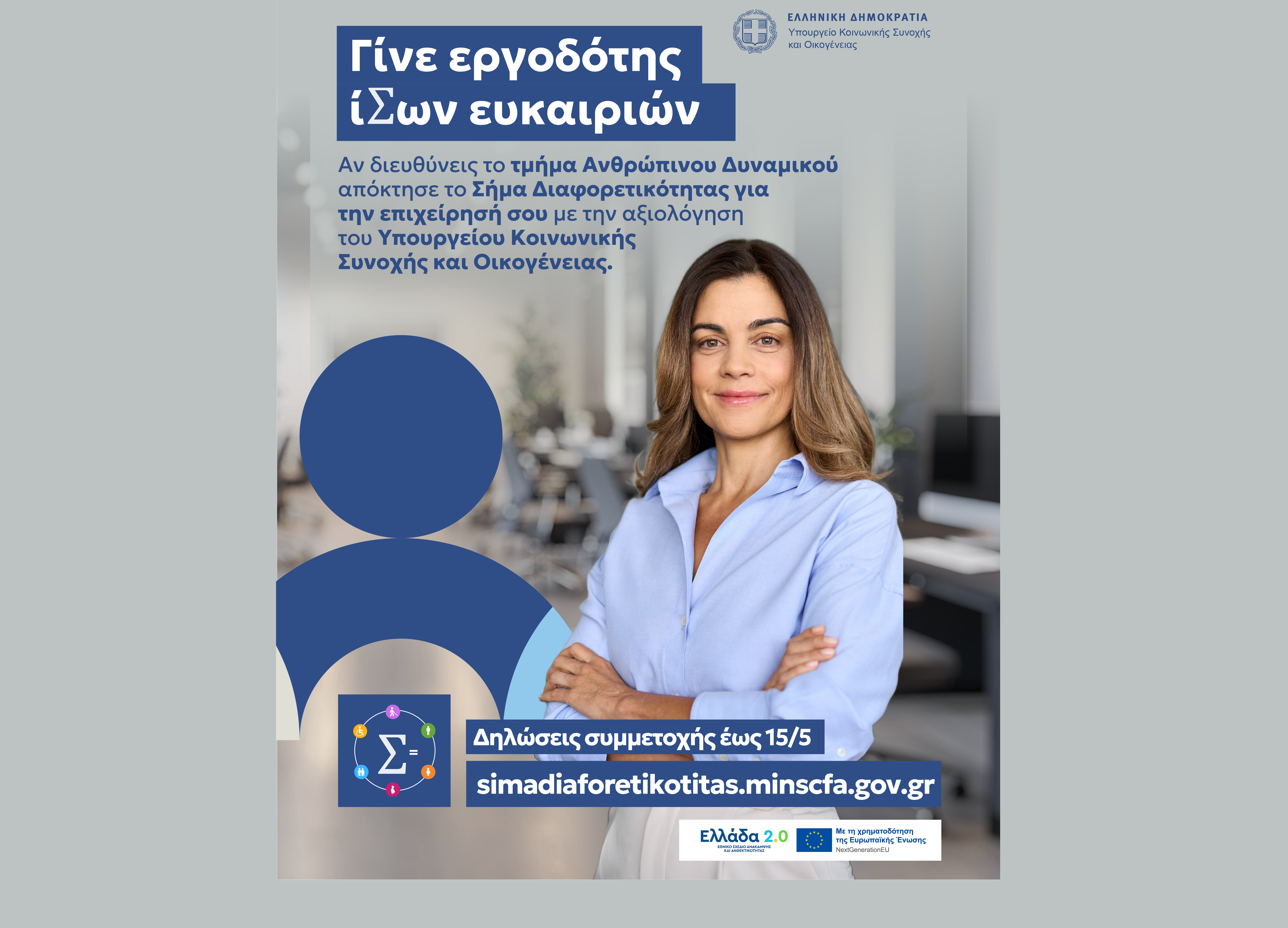 Το Σήμα Διαφορετικότητας, μια πρωτοβουλία του Υπουργείου Κοινωνικής Συνοχής και Οικογένειας, υλοποιείται πιλοτικά από τη Γενική Γραμματεία Ισότητας και Ανθρωπίνων Δικαιωμάτων στο πλαίσιο του Εθνικού Σχεδίου Ανάκαμψης και Ανθεκτικότητας «Ελλάδα 2.0», με τη χρηματοδότηση της Ευρωπαϊκής Ένωσης – NextGenerationEU.