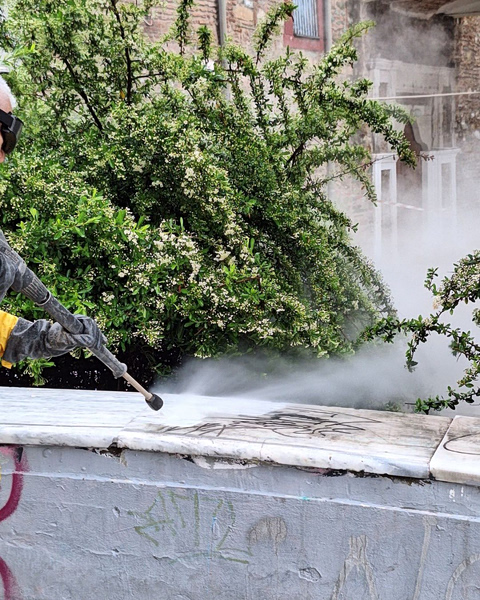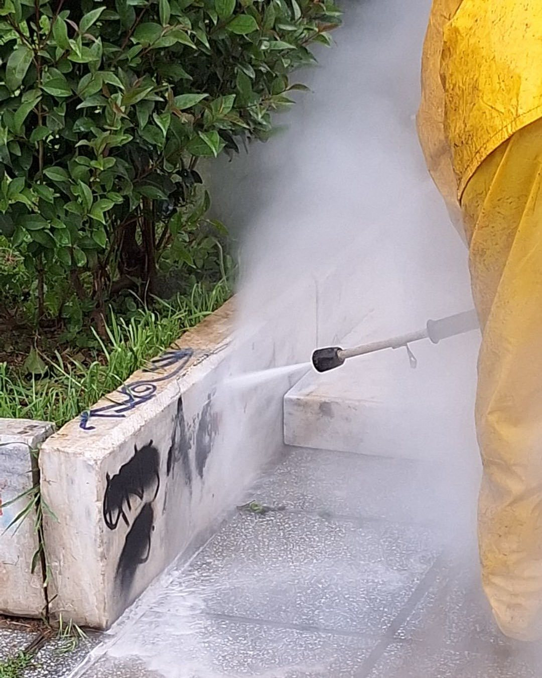 Καθαρίζει τοίχους και σημεία της πόλης ο Δήμος Θεσσαλονίκης από σπρέι και άλλα.