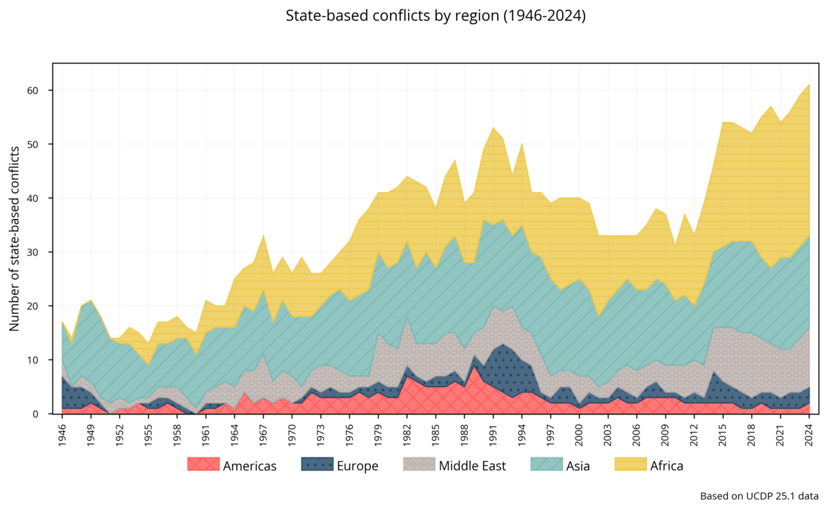 Πράγματι, οι συγκρούσεις σύμφωνα με το Uppsala Conflict Data Program (UCDP) έχουν αυξηθεί από τη δεκαετία του 1940 και ειδικά στην Αφρική.