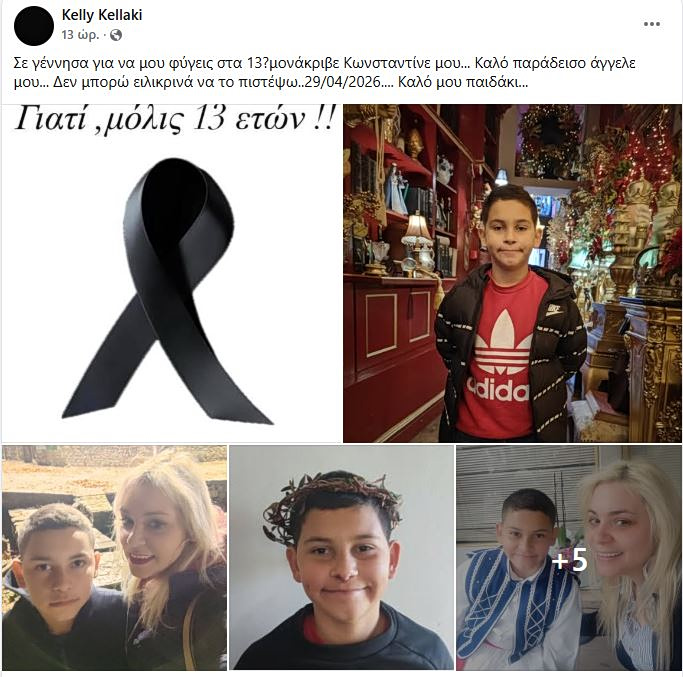 «Μονάκριβε Κωνσταντίνε μου σε πήρε ο Θεός στα 13 σου. Καλό παράδεισο μικρέ μου άγγελε, παιδάκι μου καλό», έγραψε η μητέρα του. «Έγινες άγγελος αγάπη μου, δεν μπορώ να το πιστέψω, σε γέννησα και στα 13 σου σε πήρε ο Θεός».