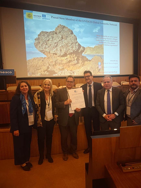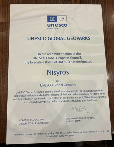 Η απονομή του τίτλου «Παγκόσμιο Γεωπάρκο UNESCO» στη Νίσυρο πραγματοποιήθηκε στο πλαίσιο επίσημης τελετής στην έδρα της UNESCO στο Παρίσι, την Δευτέρα 27 Απριλίου, παρουσία του Μονίμου Αντιπροσώπου της Ελλάδας στην UNESCO, κ. Γιώργου Κουμουτσάκου και του δημάρχου Νισύρου κ. Χριστοφή Κορωναίου, οι οποίοι παρέλαβαν το πιστοποιητικό απονομής, σηματοδοτώντας μια νέα εποχή για το νησί.