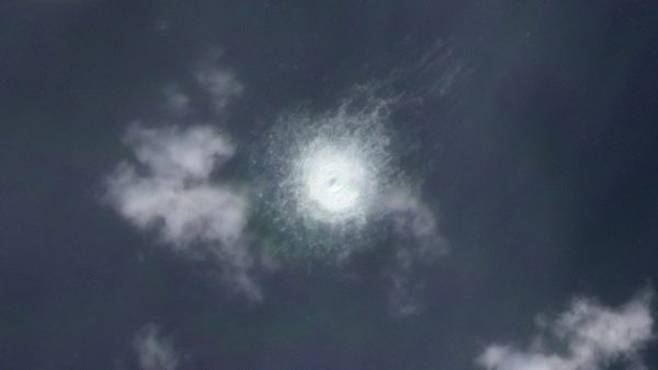 A satellite image shows a gas leak on the Nord Stream 2 gas pipeline off the Danish island of Bornholm in the Baltic Sea