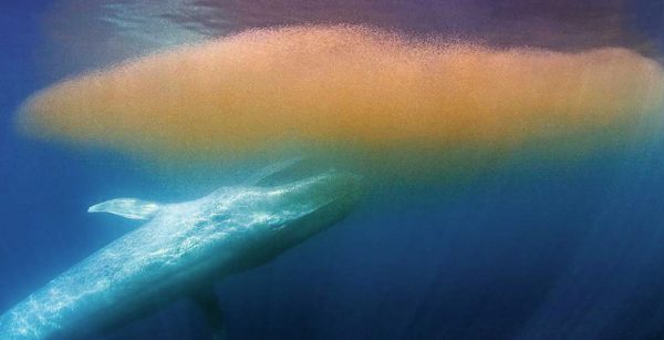 Γαλάζια φάλαινα επιτίθεται σε κοπάδι κρθλ. Το κήτος φτύνει το νερό και κρατά τα μικρά καρκινοειδή ( Richard Herrmann)