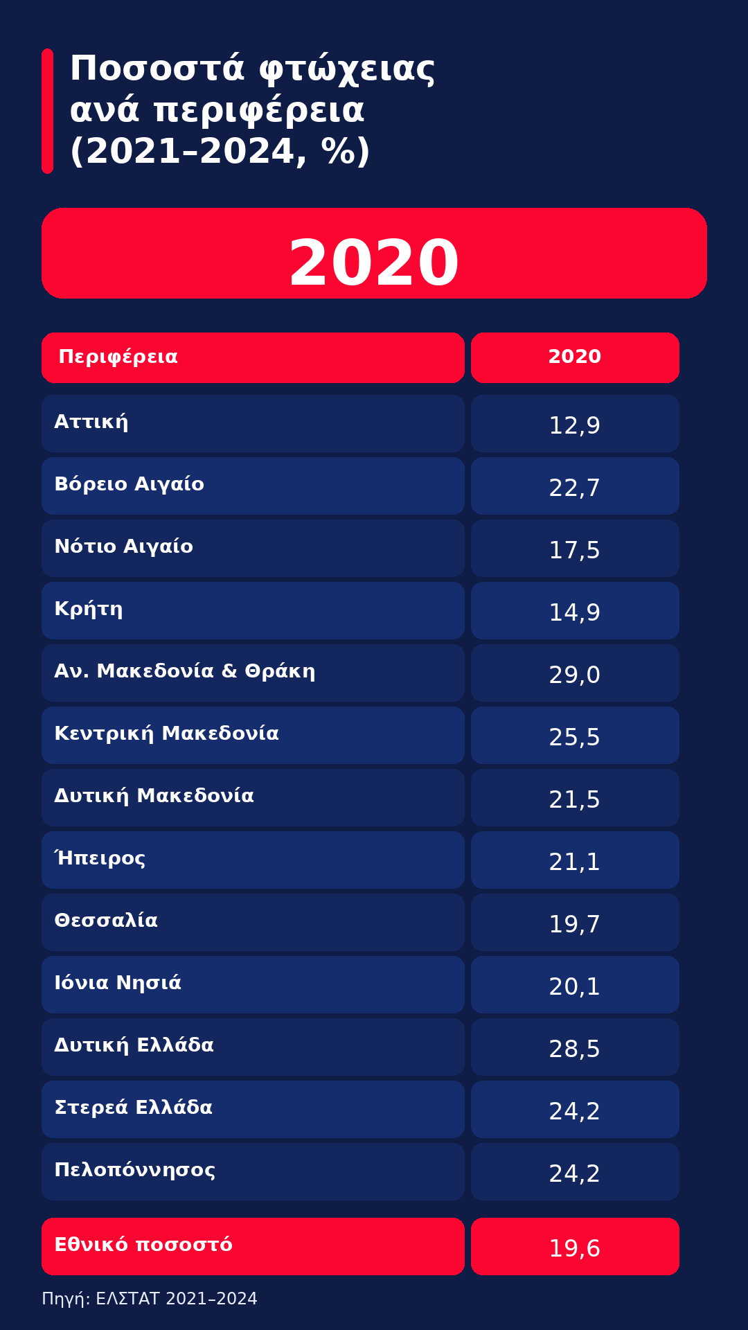 Πίνακας : Ποσοστά φτώχειας ανά περιφέρεια (2021–2024, %)