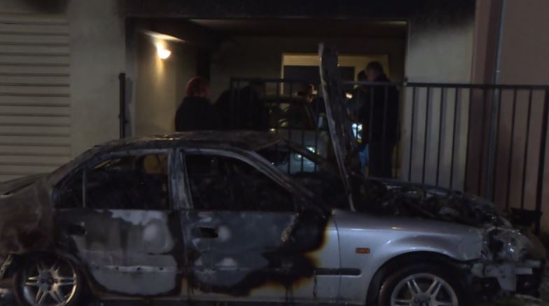 Εκτός από το αυτοκίνητο που κάηκε ολοσχερώς, ζημιές έχει υποστεί και η πυλωτή πολυκατοικίας.