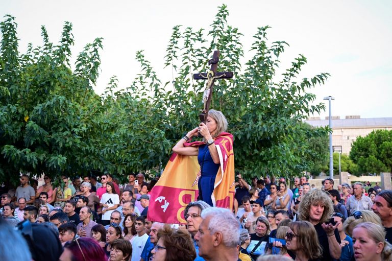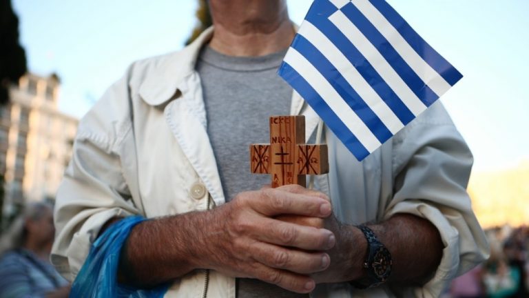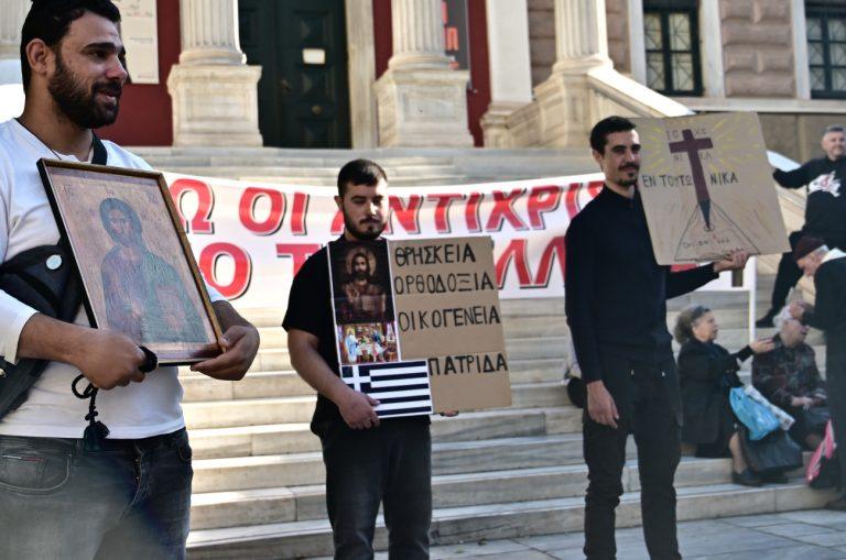 Οι συγκεντρωμένοι κατά των νέων ταυτοτήτων κρατούν ελληνικές σημαίες, αυτοσχέδια πλακάτ, ενώ δεν λείπουν τα ακροδεξιά σύμβολα.