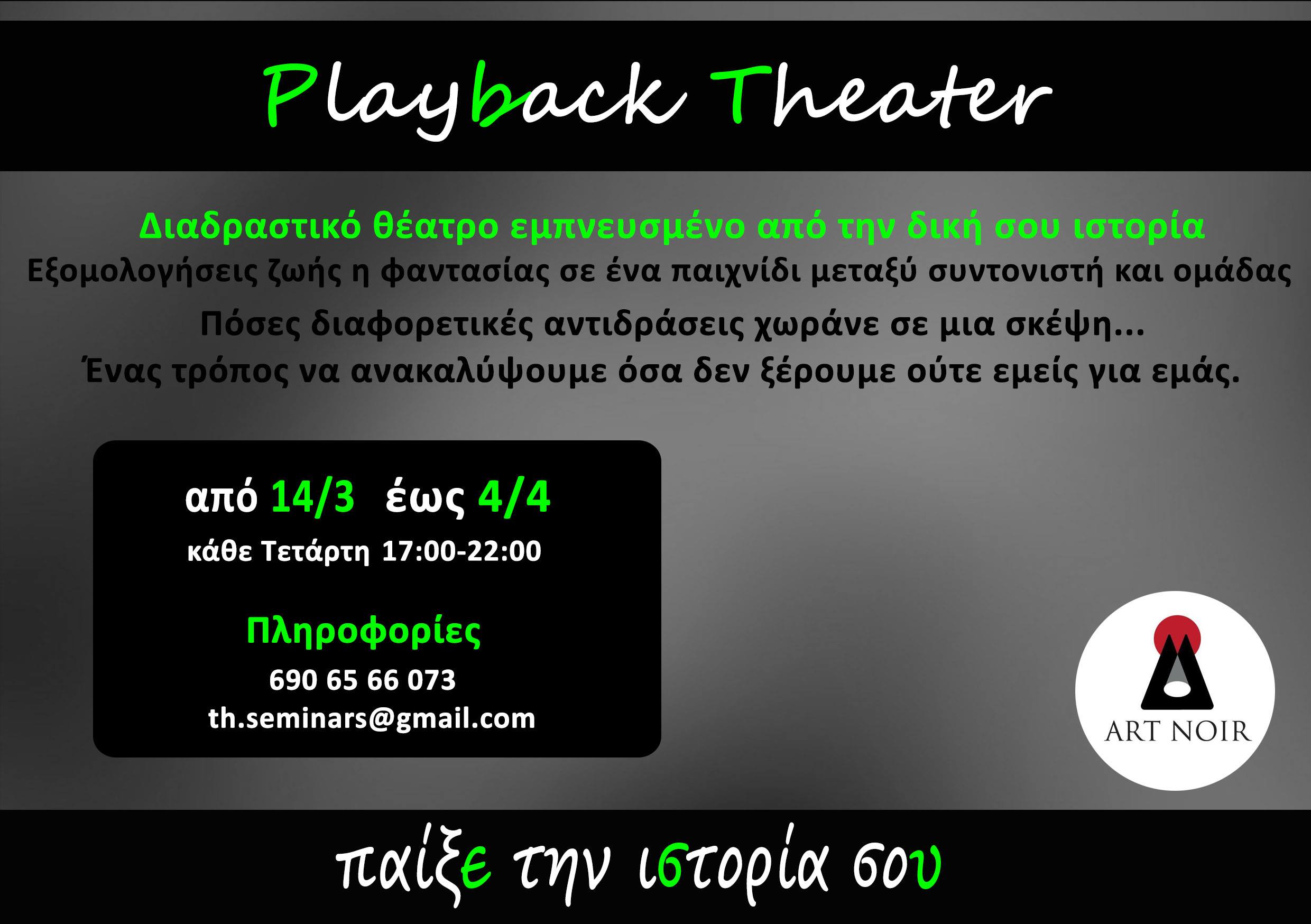 Εξομολογήσεις ζωής ή φαντασίας σε ένα παιχνίδι μεταξύ συντονιστή και ομάδας. Πόσες διαφορετικές αντιδράσεις χωράνε σε μια σκέψη… Ένας τρόπος να ανακαλύψουμε όσα δεν ξέρουμε ούτε εμείς για εμάς. Από 14 Μαρτίου έως 4 Απριλίου κάθε Τετάρτη 17:00 με 22:00 στο Playback Theatre. Τι είναι το play back theater Toplaybacktheater είναι ένα είδος διαδραστικού θεάτρου […]